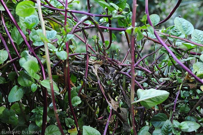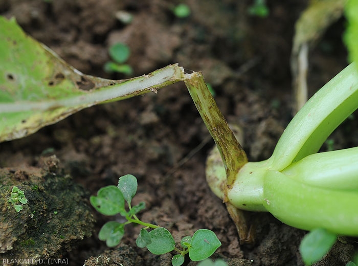 Exemple de syndrome de "Rhizoctone foliaire" sur chou.  (<i>Rhizoctonia solani</i>) (web-blight)