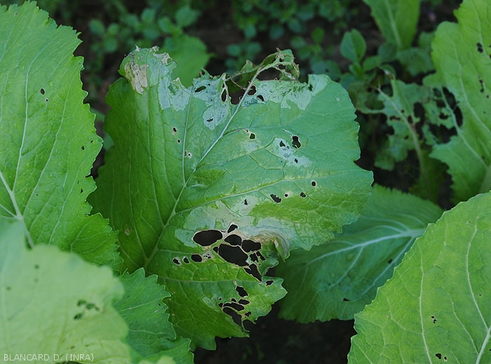 Sur cette feuille les nombreuses larges lésions couvrent pratiquement tout le limbe. Les tissus altérés sont nécrosés, sauf en périphérie où ils sont encore humides et sombres.  <i>Rhizoctonia solani</i>  (Rhizoctone foliaire - web-blight)