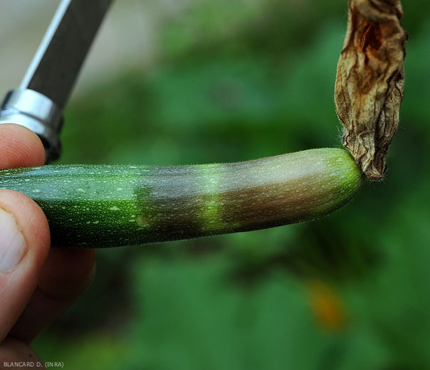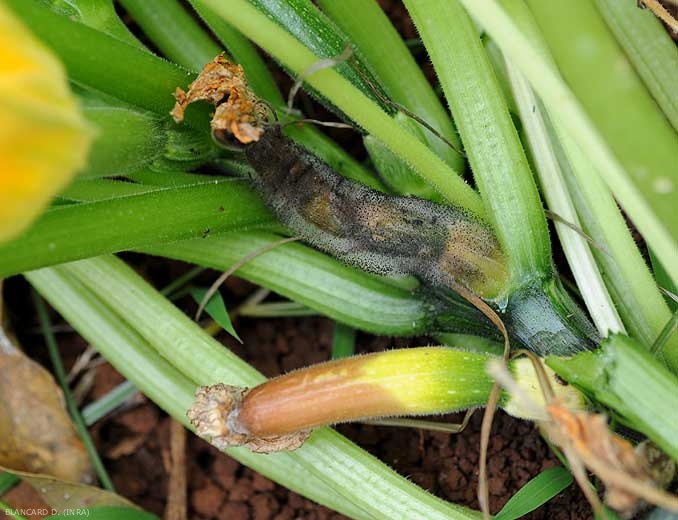 C. cucurbitarum provoque des pourritures sur les fleurs (figure 1) et par la suite sur les fruits (figure 2) des Cucurbitacées. Celles-ci sont souvent humides et située à l'extrémité des fruits. Les tissus affectés, humides et mous, prennent un aspect translucide et une teinte sombre (figures 3 et 4). Les fruits peuvent se liquéfier entièrement en quelques jours.