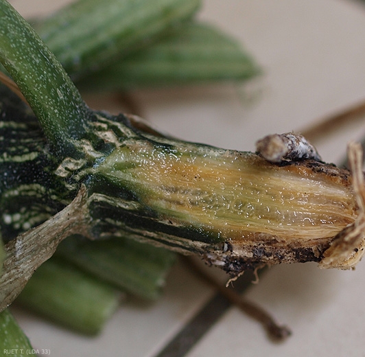 La cause des ces flétrissements est à rechercher au niveau du collet des pieds des courgettes et autres cucurbitacées sensibles. A cet endroit s'est développée une lésion humide, une pourriture qui a progressivement gagné la partie basse de la tige et le pivot, mais aussi la partie haute du système racinaire (figure 1). Au niveau du collet, les tissus altérés sont humides et montrent une teinte sombre à brunâtre (figure 4). Cette lésion finit par ceinturer la tige sur plusieurs centimètres. Notons que des lésions comparables peuvent se développer plus en auteur sur la tige, à partir de blessures ou de restants de feuilles sénescentes (figure 5). Les vaisseaux situés dans la zones altérée finissent par brunir (figure 4). Les racines situées dans la même strate du sol sont également affectées. Leur cortex jaunit, brunit et se décompose.