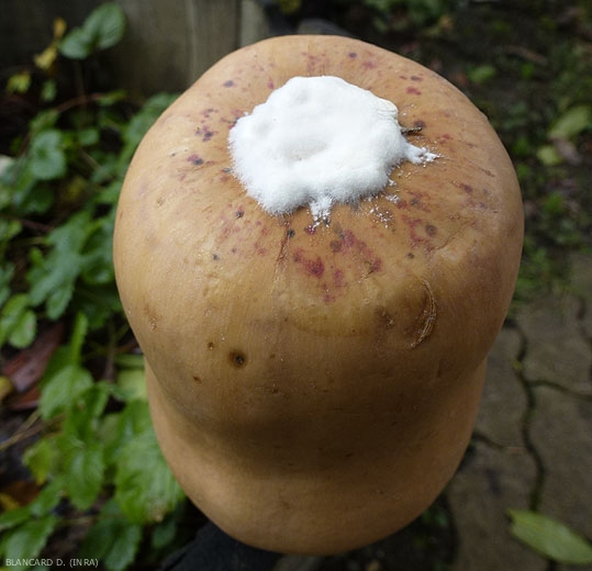 Les lésions étaient souvent humides, ou sèches et spongieuses (figure 5), conduisant à une pourriture, les tissus affectés se couvrant soit d'un mycélium blanc (figure 6) à rosâtre (figure 7), soit de sporodochies orangés (figure 8).