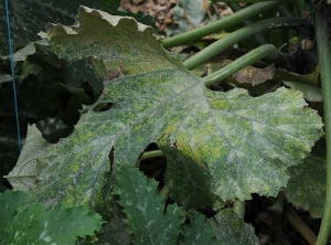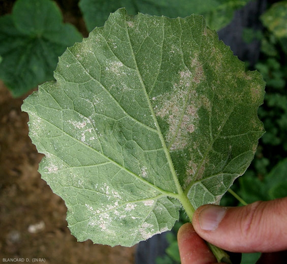 Les dégâts de Tetranychus urticae sur courgette et courges se manifestent par l'apparition de minuscules taches chlorotiques plus ou moins dispersées sur le limbe (figures 1 à 4 ). Ce dernier jaunit progressivement et prend une teinte terne.