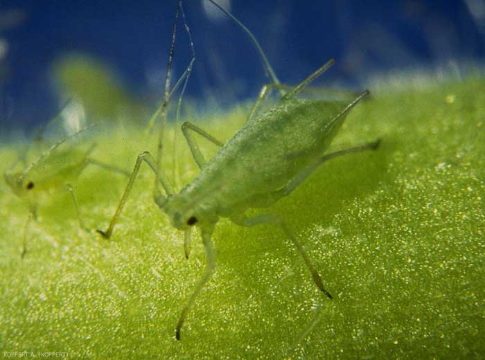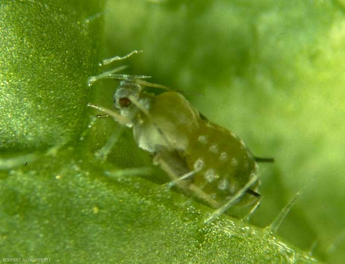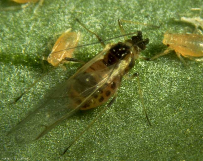 Des jeunes larves se forment, qui se nourrissent immédiatement de la sève et muent 4 fois avant de donner naissance à l'adulte. Des mues blanches (exuvies) sur la végétation trahissent la présence de pucerons dans la culture. Les adultes sont ailés (1 - figure 5) ou non ; dans le dernier cas on parle d'individus « aptères » (2 - figure 5). Chaque individu peut donner naissance à 40-100 descendants en fonction de l'hôte et des conditions climatiques notamment.