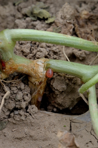 - des altérations chancreuses sur le collet et la tige (figures 1 à 5). Celles-ci sont souvent vert foncé et humides en début d'attaque et peuvent mesurer entre 5 et 15 centimètres. On peut voir apparaître en surface des gouttelettes gommeuses ambrées, s'assombrissant en s'oxydant (figures 6 et 7). Par la suite, ces lésions se dessèchent, subérisent, prennent une teinte brunâtre,  et sont parsemées parfois d'une multitude de microsclérotes noirs  (50 à 200 µm) (figures 8 et 9) et de pycnides. Notons que les lésions sur tige rappellent celles occasionnées par Didymella bryoniae ;