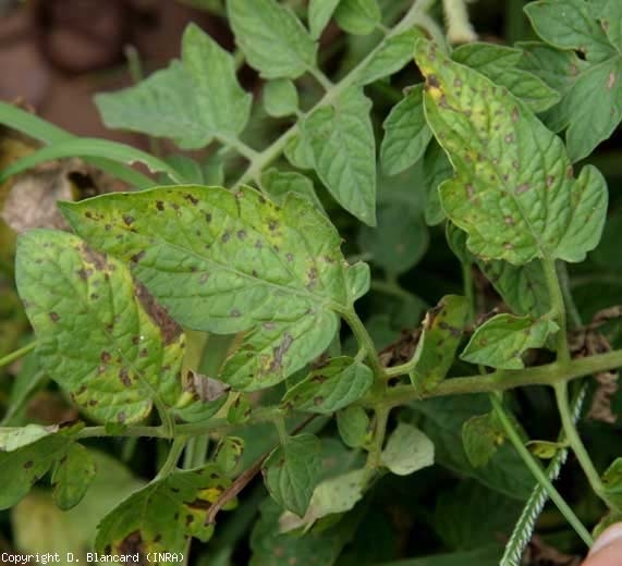 Di minuscole macchie brunastre , leggermente angolose, a volte discretamente aloni da un bordo clorotico, si possono osservare su tutte le foglioline del pomodoro (Figure 1 e 4). La loro dimensione è spesso limitata a pochi millimetri, salvo in condizioni particolarmente umide che ne favoriscono l'estensione e la confluenza. In questo caso possono occupare ampie porzioni della lamina fogliare. Di solito, le macchie si schiariscono gradualmente e alla fine assumono una tinta grigiastra mentre si necrotizzano e si seccano . di Corpi fruttiferi Stemphylium spp. (masse brune corrispondenti a conidi maturati) sono visibili con una lente di ingrandimento binoculare su entrambi i lati della lama. Il tessuto danneggiato ha un aspetto opaco e talvolta si divide (Figure 3 e 4). Durante attacchi particolarmente gravi, l'elevata densità di macchie, la loro maggiore estensione e la loro confluenza inducono significative mortalità fogliari, precedute da ingiallimento (figura 5), ​​e caduta fogliare più o meno consistente.
