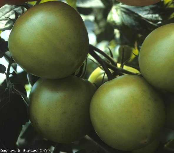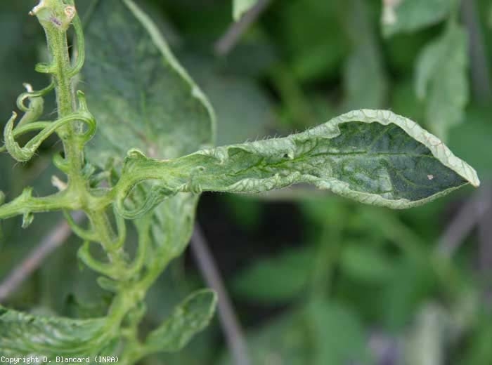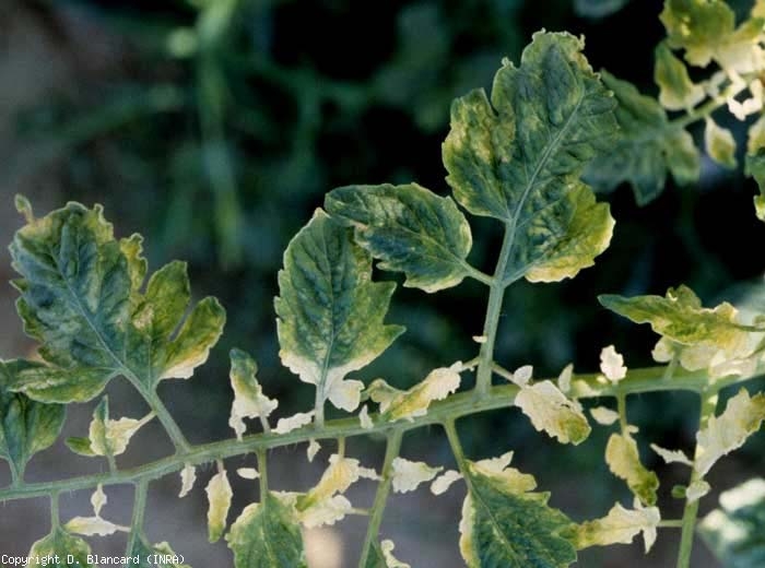 l' appassimento di essiccazione , e la necrosi foglia . Pertanto, i volantini delle piante di pomodoro colpite possono presentare:- chiazze internervali livide sulle foglie inferiori, che si estendono, necrotizzano e si disseccano gradualmente;- necrosi e disseccamento della periferia del lembo di foglie giovani e vecchie;- appassimento e disseccamento delle foglie dell'apice .
