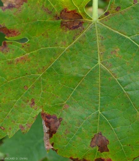 In condizioni climatiche favorevoli, il rapido sviluppo della peronospora sulla pianta porta alla distruzione di molte foglie (figure 9 e 10), e molte viti sono colpite, prima divise in focolai prima che l'appezzamento sia completamente colpita (figura 11).