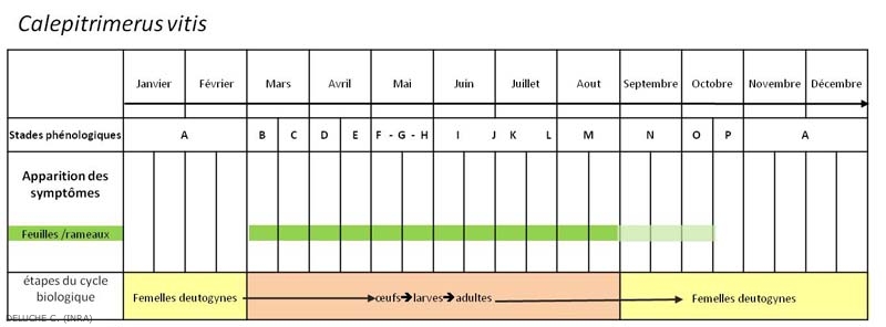 • Gli adulti migreranno ascendendo, il che permetterà loro di seguire la crescita della vegetazione della vite, e quindi di nutrirsi delle giovani foglie. Le femmine protogine si osservano da maggio a ottobre. Dal mese di agosto le uova deposte daranno femmine deutogine. Dall'invaiatura le femmine iniziano a migrare verso la base dei tralci.