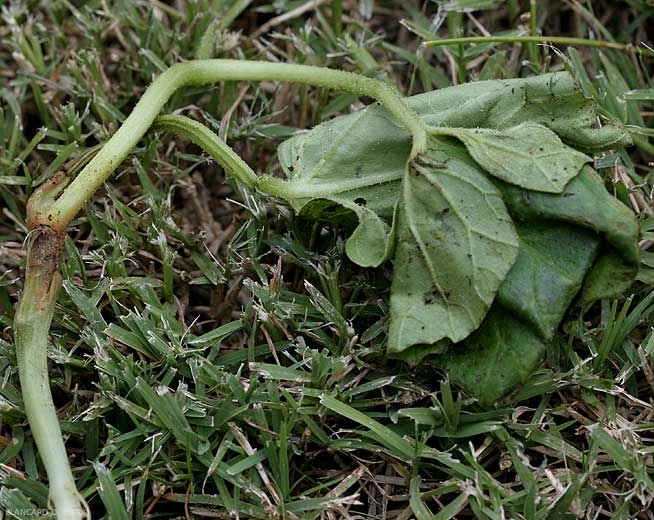 Ce champignon étant transmissible par les semences, les plantules peuvent être attaquées précocement dès la germination. Des taches humides et sombres peuvent se développer sur les cotylédons (figure 1), les tiges, et entraîner la mort des plantules.