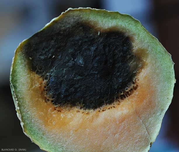 Les symptômes visibles sur les fruits des cucurbitacées sont très influencés par le comportement de parasites opportunistes de D. bryoniae. En effet, la pourriture noire qu'il provoque s'initie souvent à partir de pièces florales plus ou moins sénescentes (ou dans des zones des fruits où l'on retrouve ces dernières - zone stylaire), ou des micro blessures (zone pédonculaire). Notons que les jeunes fruits sont plutôt plus sensibles. Ainsi, des lésions de taille limitée dans un premier temps, humides et sombres, se développent sur les fruits (figure 8), et des exsudats gommeux se forment. De larges lésions peuvent s'initier au contact du sol (figure 9). De forme irrégulière, elles s'étendent et noircissent progressivement. Dans certain cas, le développement de D. bryoniae peut-être insidieux et s'effectuer essentiellement à l'intérieur des fruits (figure 10). Assez rapidement, les tissus noircissent, restent momentanément fermes et la lésion s'étend. Le concombre est particulièrement affecté par ce type de symptômes, présentant souvent un pincement à son extrémité. La pastèque, les courges qui sont conservées durant de longues périodes, sont également sensibles aux attaques de D. bryoniae. Les courges révèlent  une pourriture noire (black rot) en cours de conservation, celle-ci se généralise à l'intérieur des fruits.