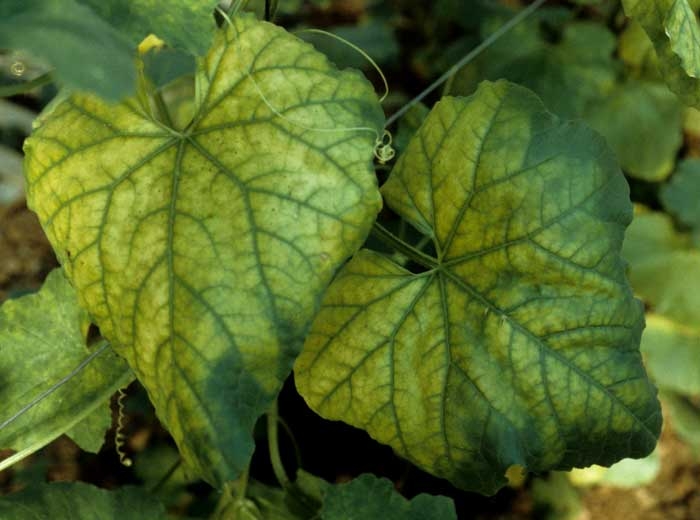 Les virus CMV, ZYMV, WMV2, PRSV et SqMV sont responsables d'anomalies de coloration des feuilles. Les symptômes qu'ils induisent sont répertoriés dans le tableau suivant :