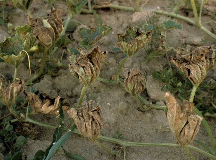 Sur melon, les taches sur feuilles sont d'abord humides (figures 1 à 3), puis elles jaunissent (figures 2 et 4), brunissent, et se nécrosent rapidement (figures 3 et 5). A terme, un liseré chlorotique les entoure (figure 4 ). Ces taches s'initient parfois à proximité des nervures qui brunissent sur une portion plus ou moins limitée. Durant des périodes très humides, les tissus affectés peuvent se décomposer et tomber.