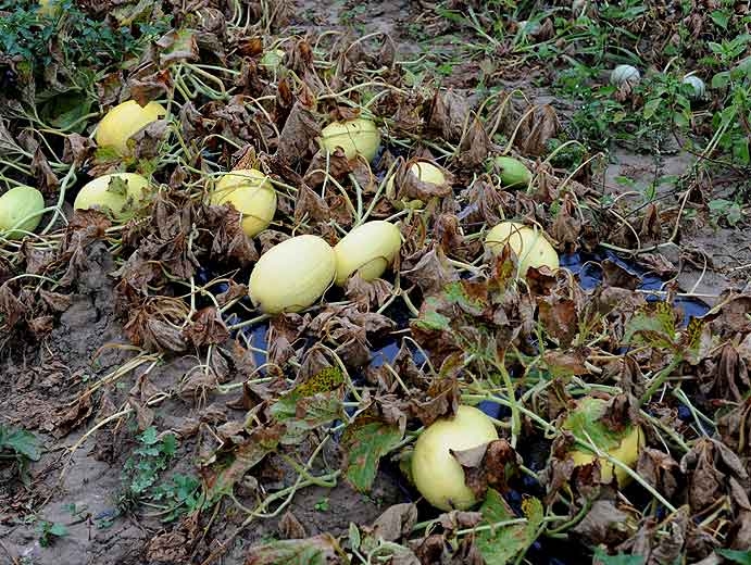 De plus, le mildiou progresse très rapidement sur les feuilles, les plantes et dans les parcelles. Les feuilles de melon se dessèchent entièrement et restent fixées à la plante, dressées et enroulées (figures 10 à 13).