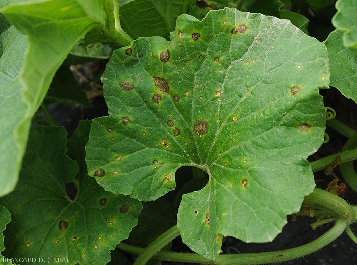 Les feuilles des Cucurbitacées présentent des taches plutôt circulaires brun sombre, révélant parfois des motifs concentriques et coalesçant.