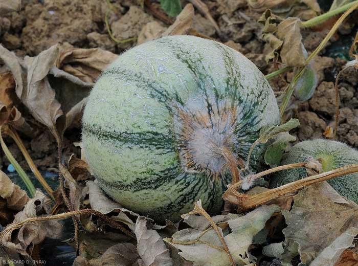 Une pourriture humide s'initie au niveau de la zone pédonculaire et parfois stylaire des fruits (figures 16 et 18). Ce symptôme est moins fréquent que les manifestations foliaires. Une moisissure rose couvre progressivement cette lésion. Le champignon parasite vasculaire ayant colonisé le fruit s'extériorise sur ce dernier. Notons que les melons pourraient manifester des symptômes après récolte.