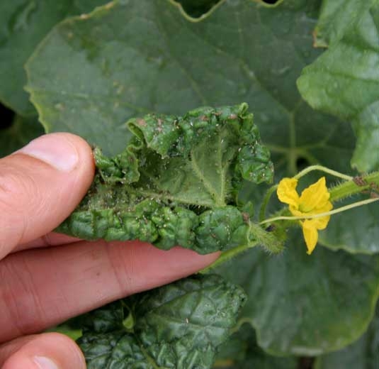 Les piqûres nutritionnelles sont à l'origine des ponctuations chlorotiques et peuvent déformer les jeunes feuilles qui sont enroulées et plus ou moins boursouflées (figures 1 à 3). Une réduction de la croissance des jeunes pousses, voire des plantes, peut être constatée (figure 4). En plus des colonies de pucerons, on observe bien souvent des mues blanches et la présence de miellat à la surface des organes aériens du melon, sur lequel se développe la Fumagine (sooty mold) (figures 6 à 8). Rappelons que cette dernière peut avoir plusieurs conséquences, notamment une réduction de la photosynthèse et de la respiration foliaire et la souillure des fruits rendus ainsi non commercialisables.