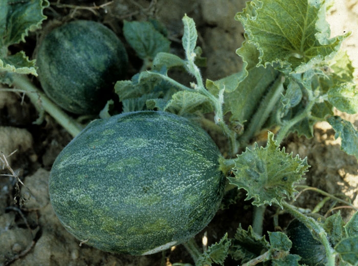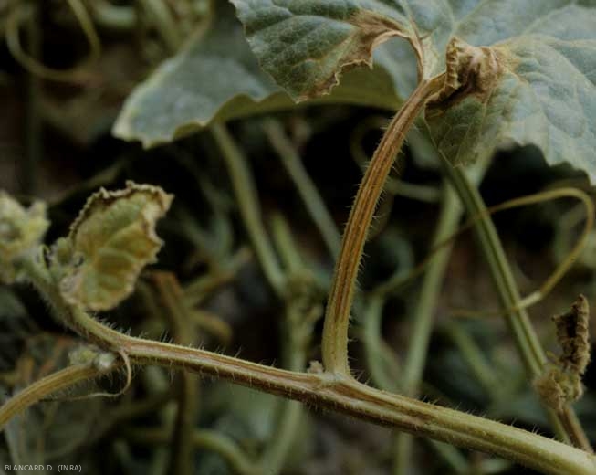 De plus, certaines souches de ZYMV sont responsables chez un grand nombre de variétés commerciales de melon (possédant un gène particulier, le gène Fn) un flétrissement très rapide de la plante infectée (figures 6 et 7). Cette dernière se dessèche alors complètement en quelques jours. Ce symptôme peut faire penser à une attaque de Fusarium ou à celle d'un autre pathogène vasculaire, mais dans ce cas, les vaisseaux du collet ou de la tige restent intacts.