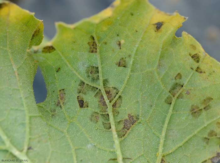 Sur pastèque, les taches foliaires peuvent être angulaires ou non, et de couleur brune à noire. Sur les feuilles des courges et du potiron, elles auraient une teinte plutôt orangée que jaune.