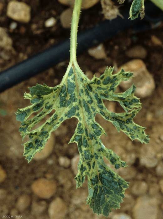 Les premiers symptômes sur feuillage sont un éclaircissement des nervures (figure 2) et un jaunissement (figure 3) qui évoluent vite en mosaïque (figures 4 et 11). Les symptômes deviennent rapidement beaucoup plus sévères avec d'importantes déformations : boursouflures et cloques vert foncé (figure 5), feuilles en "lacet de chaussure" (filiformisme) (figures 6 et 7). Ces derniers symptômes peuvent aujourd'hui être confondus avec ceux produits par les souches sévères de WMV.