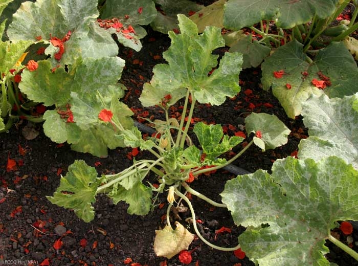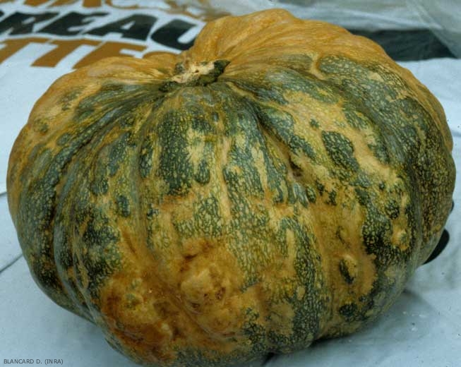 Le virus de la mosaïque de la courgette (Zucchini yellow mosaic virus, ZYMV), de par les nombreuses souches signalées dès la première description de ce virus, est à l'origine de symptômes assez différents. De plus, ceux-ci peuvent varier en intensité en fonction de la saison (ils sont généralement plus sévères en été), l'espèce ou la variété infectée. Notons que des symptômes plus accentués peuvent être observés en cas de co-infection avec d'autres virus (synergie), et en particulier avec le virus de la mosaïque du concombre (CMV). C'est probablement chez la courgette que le ZYMV provoque les symptômes les plus spectaculaires (figures 1 et 7), et c'est souvent chez cet hôte que ce virus a été signalé, initialement, dans de nombreux pays.