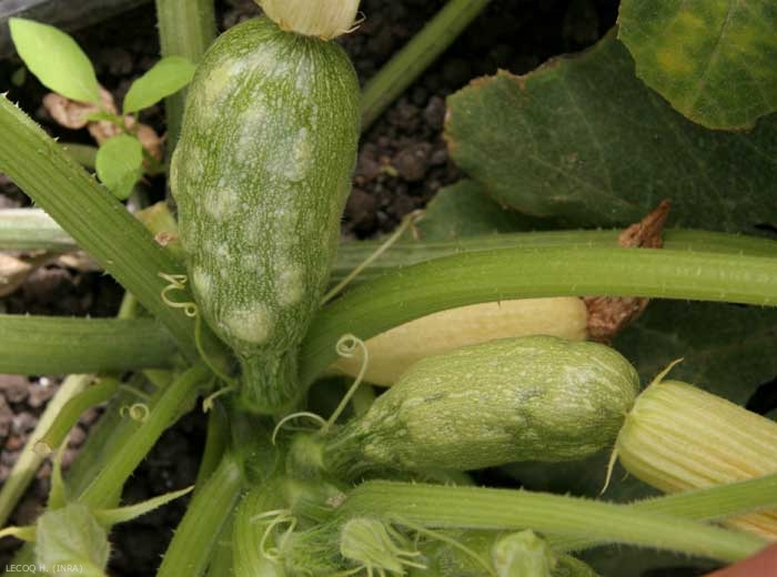 Les symptômes sur fruits sont aussi très spectaculaires : décoloration particulièrement marquées sur les variétés à fruits jaunes, et surtout importantes boursouflures qui déforment complètement les courgettes (figures 8 à 10) et les courges (figures 12 et 13). Les fruits ne sont bien sûr pas commercialisables, et la perte de récolte peut être complète en cas d'infection précoce.