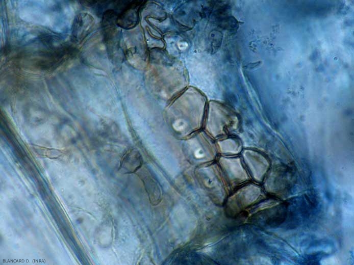 Aspect au microscope photonique du mycélium formé dans le cortex des racines de tomate par <b><i>Colletotrichum coccodes</i></b>.