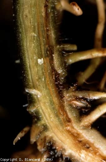 Détail d'un chancre au collet occasionné par <b><i>Fusarium oxysporum</i> f. sp. <i>radicis-lycopersici</i>.  (FORL)</b> (<i>Fusarium</i> crown and root rot)