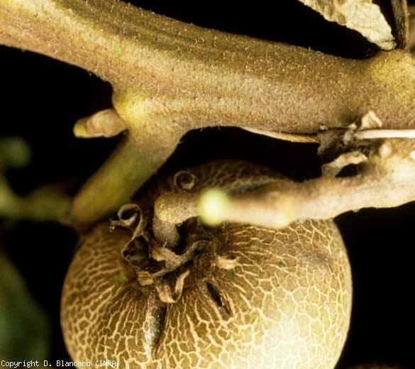 Questo frutto verde gravemente colpito è interamente suberizzato e screpolato in superficie;  il bronzo tinto tradisce un attacco di acariosi bronzata.  <i> <b> Aculops lycopersici </b> </i> (acaro ruggine del pomodoro)