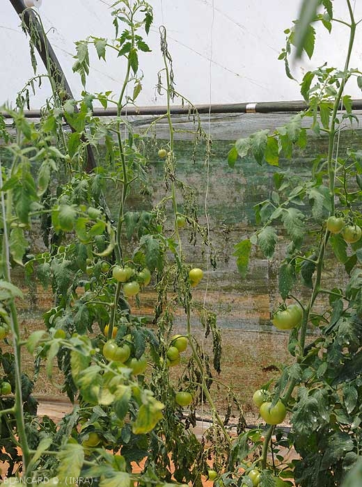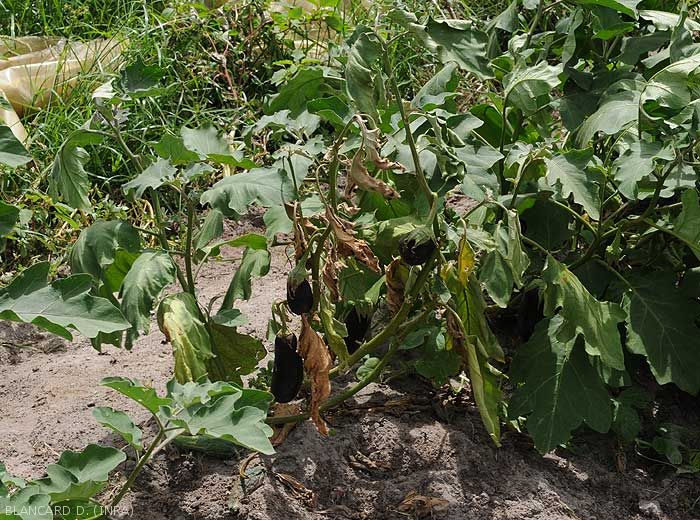 Sur ce pied de pomme de terre, les folioles de certaines feuilles sont enroulées, sur la feuille la plus basse, elles sont flétries voire desséchées. <i><b>Ralstonia solanacearum</i></b> (flétrissement bactérien)