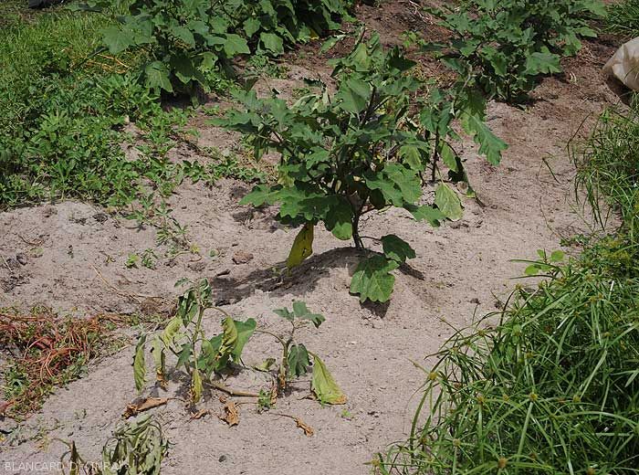 Flétrissement de 3 pieds de courgettes sur une ligne de plantation : <i>Ralstonia solanacearum</i>