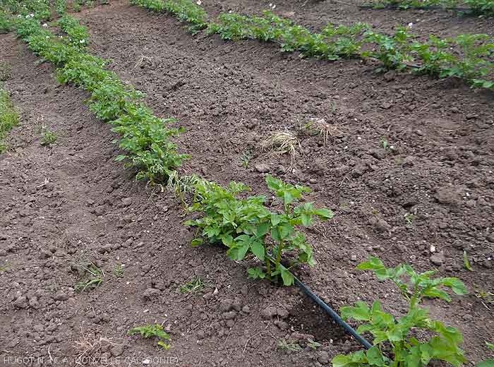 Une pied de pomme de terre est entièrement flétri sur ce rang de plantation. <i><b>Ralstonia solanacearum</i></b> (flétrissement bactérien)
